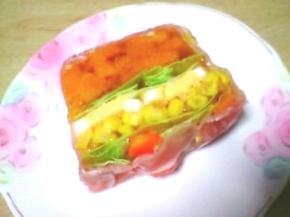 | 下準備☆パウンド型に霧吹きで水を拭きかけ、サランラップを中に敷いておきましょう。 コーンの缶詰は水気を切っておくと良いですよ。 @にんじんを5oの厚さでクッキーの型や野菜抜きで切り取ったり、扇形に切る。 カボチャをレンジで1分ほどチンして一p角に切る。キャベツは3p角に切る。 ゆで卵を作っておく。 Aお湯3カップにチキンコンソメをドボトボ入れチキンコンソメスープを作る。 沸騰したら塩・胡椒・タイム・ローリエ、にんじんを投入。 B人参が柔らかくなったら取り出し、キャベツを1分ほど投入して取り出す。 C鍋から300mlスープを取り、粉ゼラチンを溶かして冷ましておく。 DバットにCのゼラチン入りスープを少量流し、生ハムを一枚一枚潜らせてサランラップを敷いた型の上に並べていく。(底と側面を隙間なく生ハムで埋めていってください。) Eカボチャ、にんじん、キャベツ、ゆで卵、コーンを適当な順番に並べ、層を作る。 F上から残りのゼリー入りチキンコンソメスープを流し入れ、生ハムで蓋をし、ラップをかけて冷蔵庫で一晩固める。 G食べる直前に型から外し、2p幅くらいに切って皿に盛りつける。 この料理は前日の晩に作っておくのが良いですよ。 夏は長時間出しておくと溶けるので注意!! |